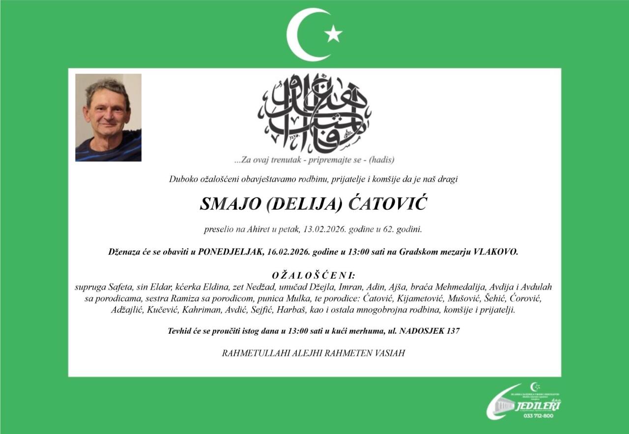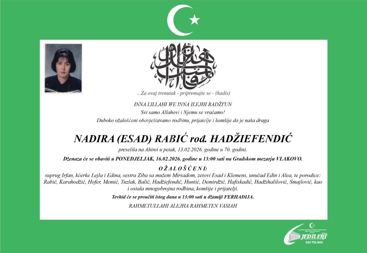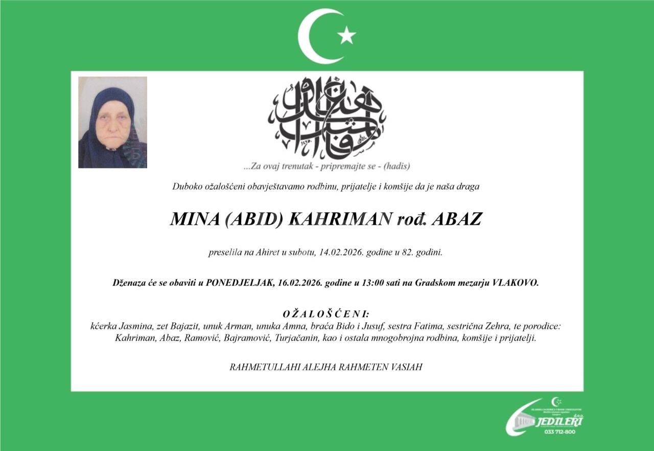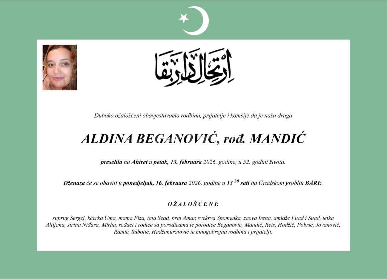 Dženaza: ponedjeljak, 16.02.2026. u 15:15h