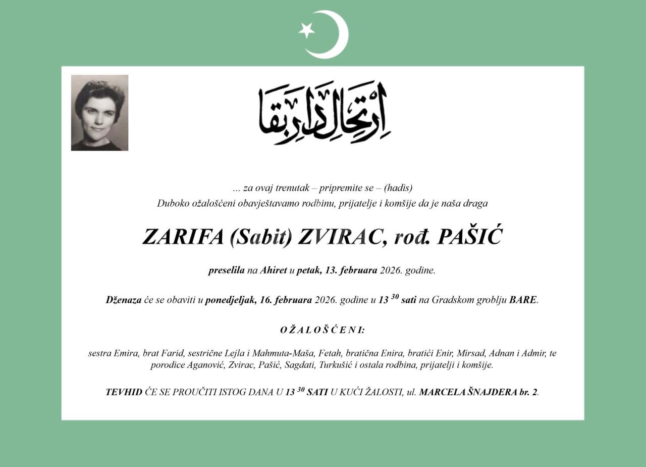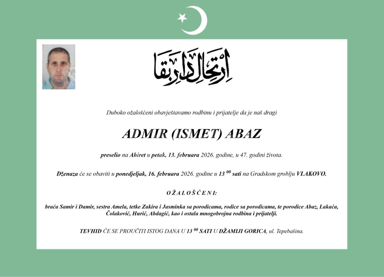 Dženaza: ponedjeljak, 16.02.2026. u 13:30h
