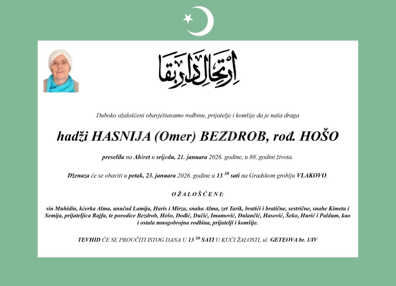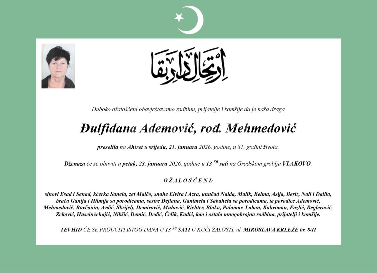 Dženaza: petak, 23.01.2026. u 13:30h