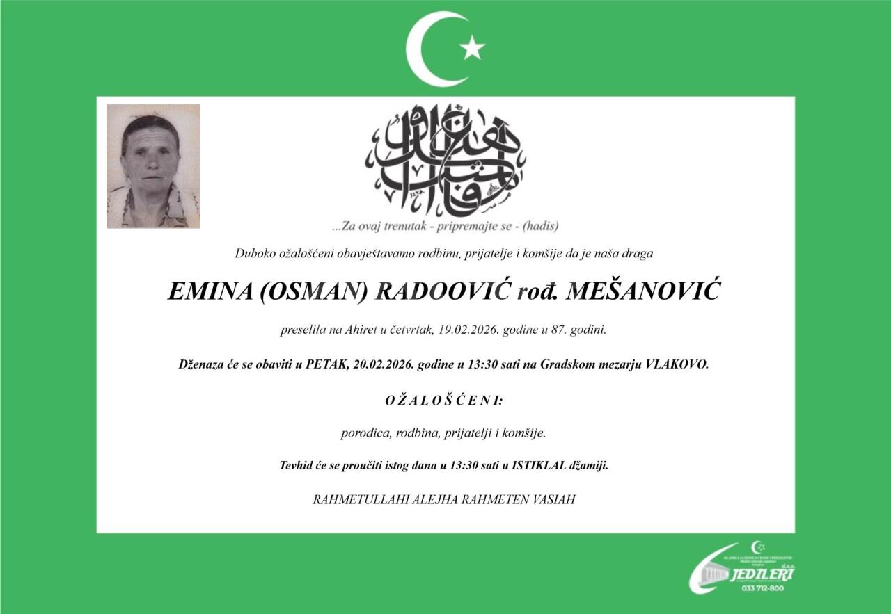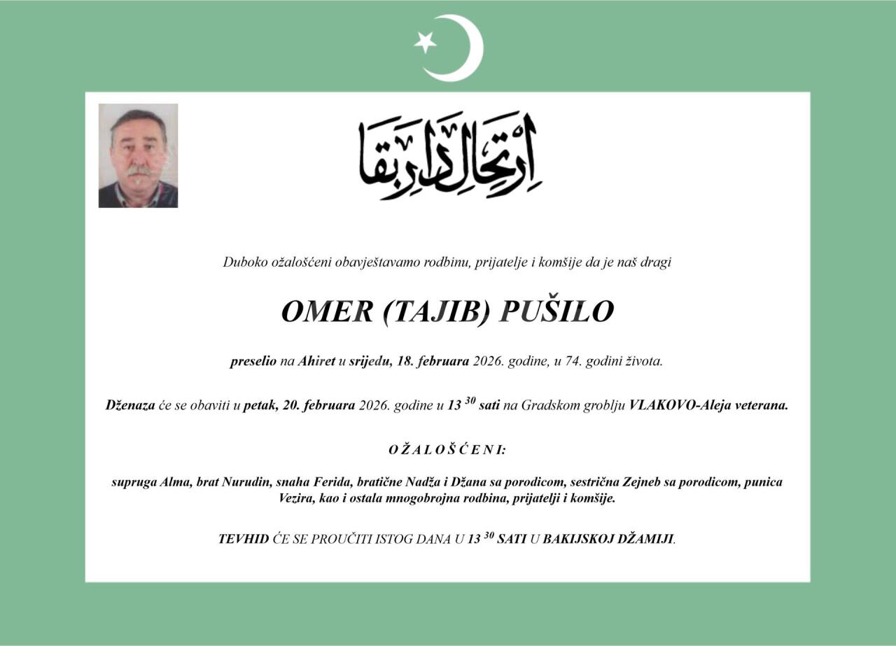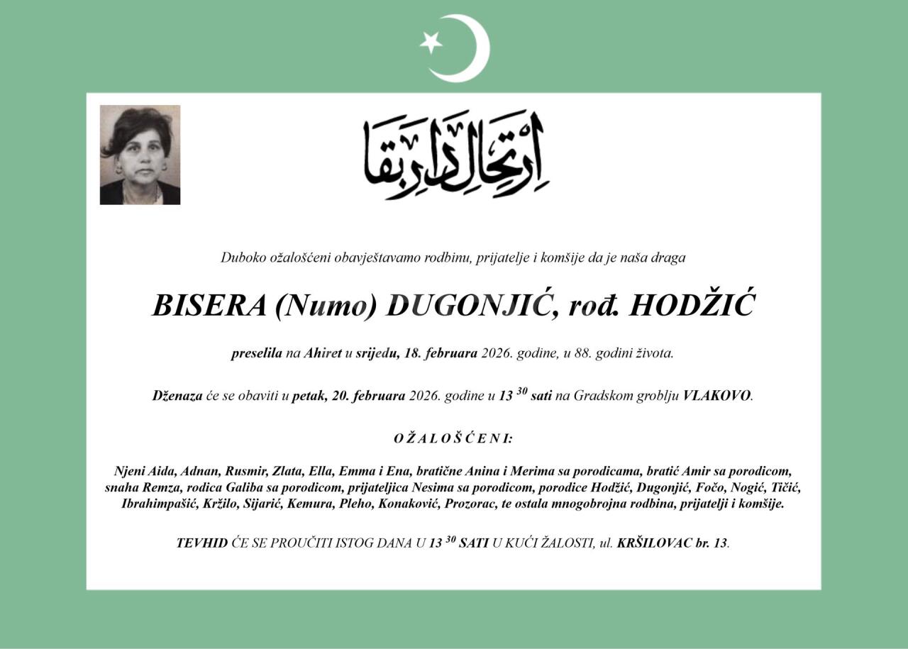 Dženaza: petak, 20.02.2026. u 13:30h