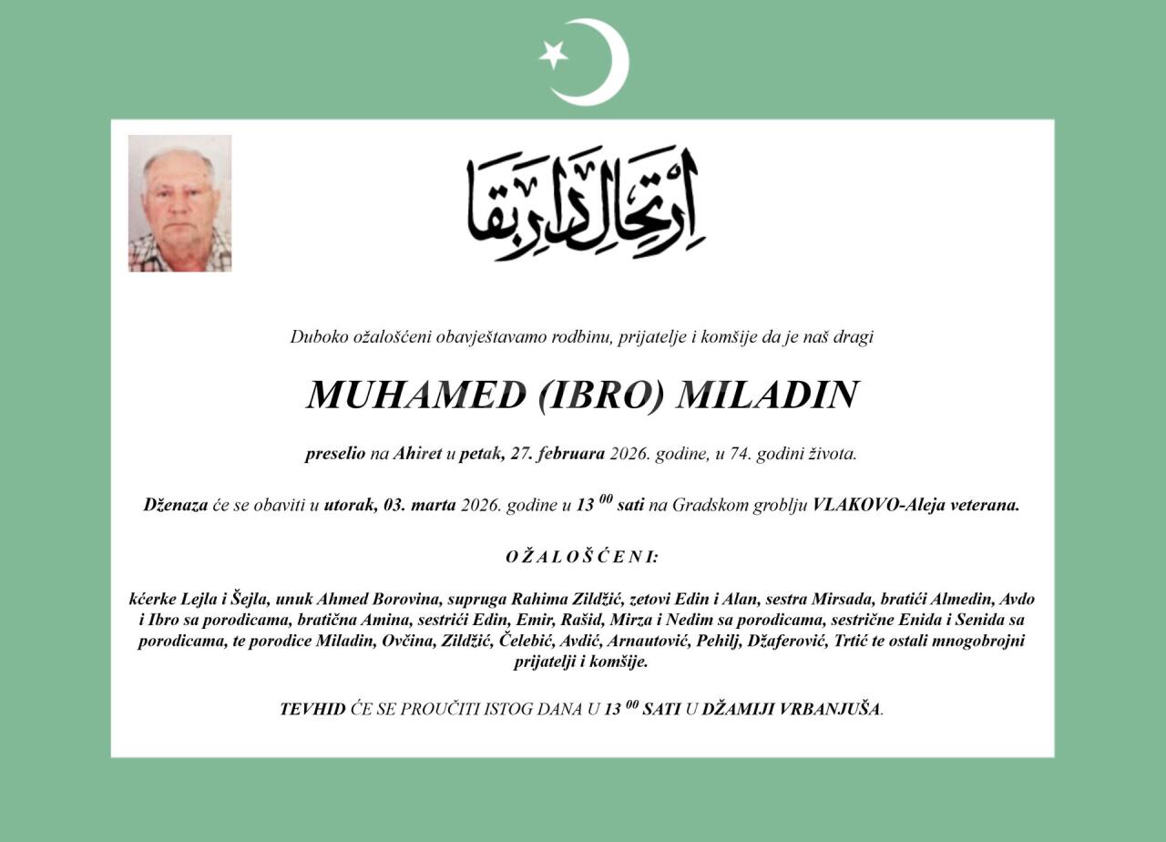 Dženaza: ponedjeljak, 02.03.2026. u 15:30h