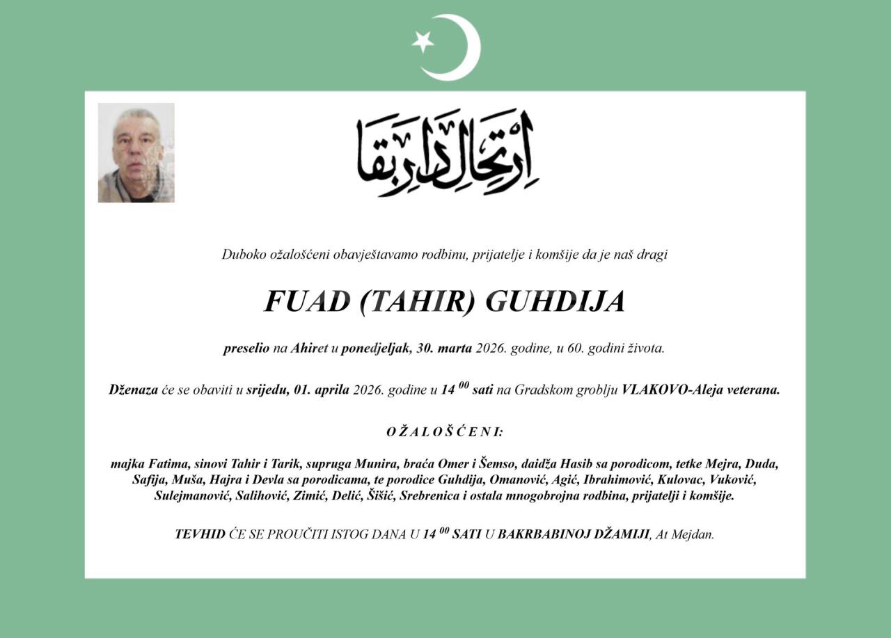 Dženaza: srijeda, 01.04.2026. u 15:30h
