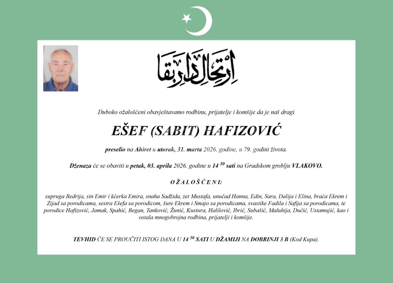 Dženaza: petak, 03.04.2026. u 14:30h