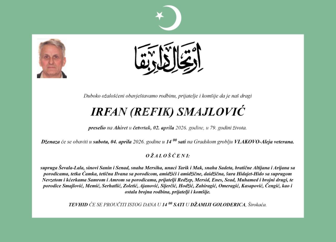 Dženaza: subota, 04.04.2026. u 14:00h