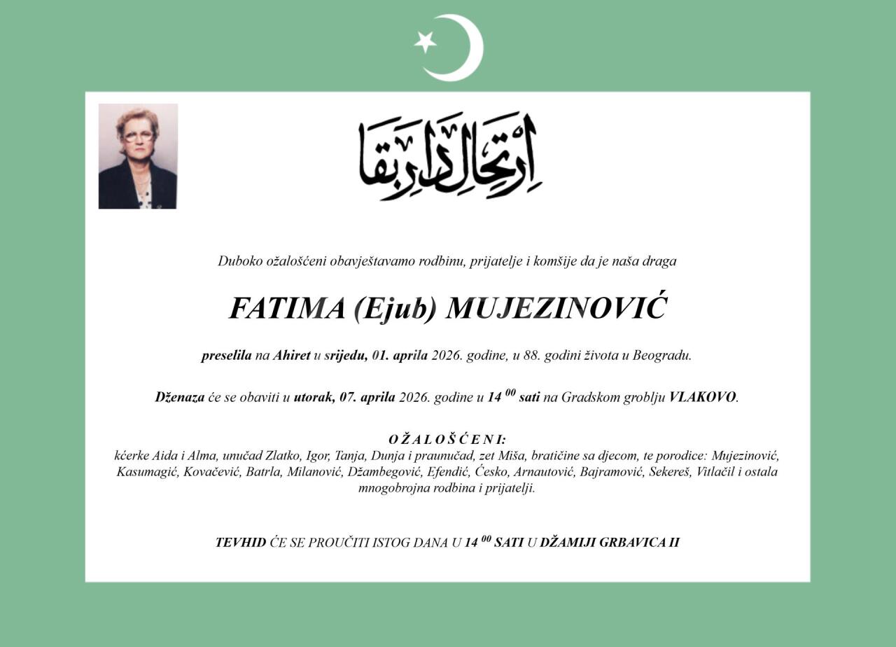 Dženaza: ponedjeljak, 06.04.2026. u 14:30h