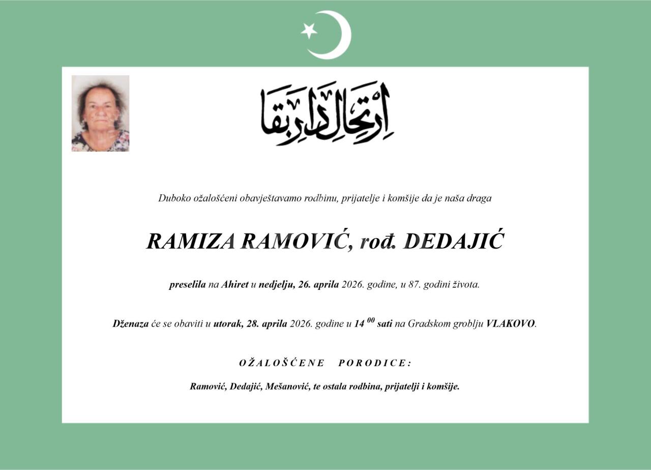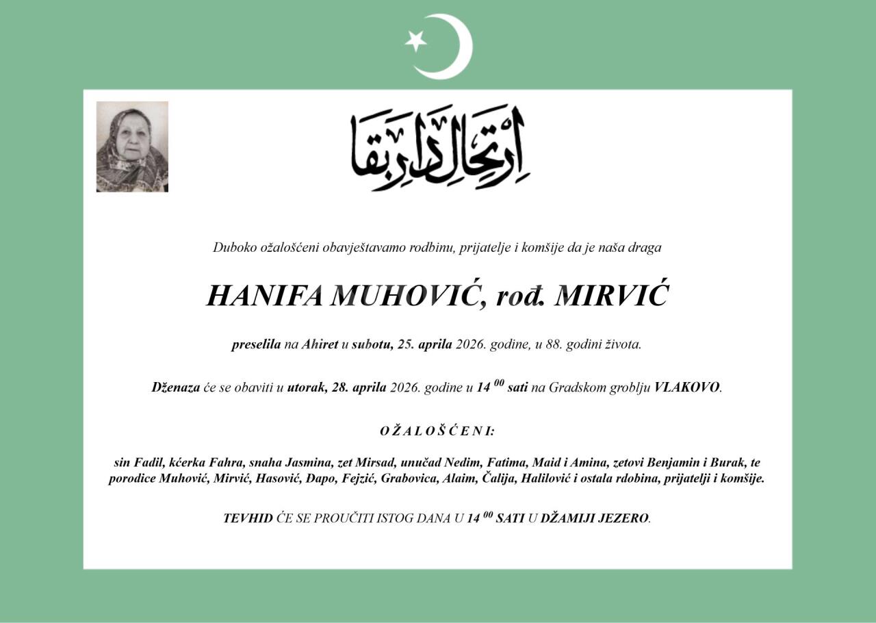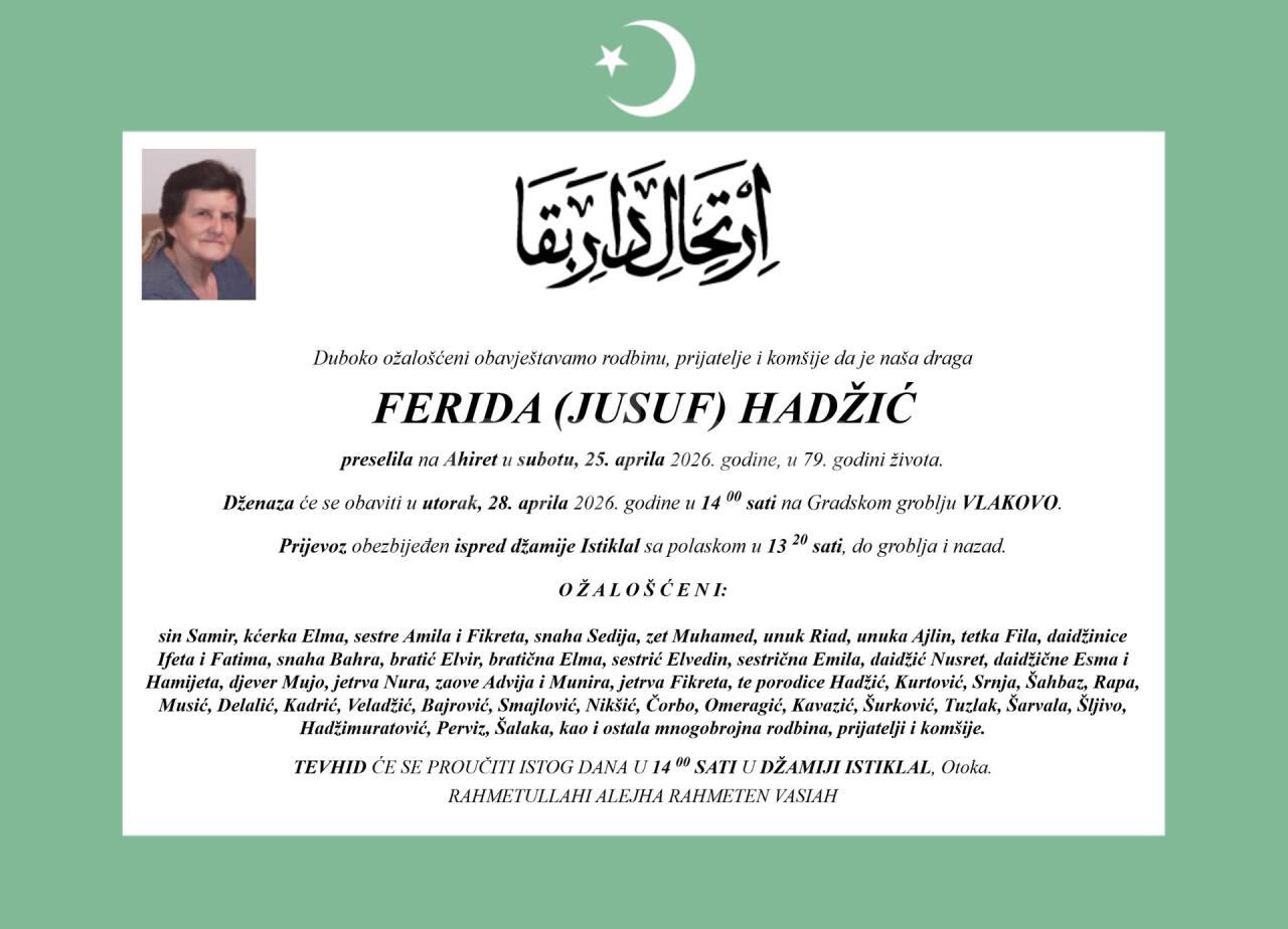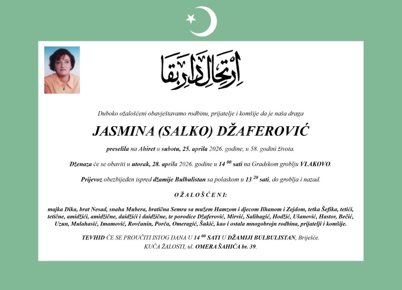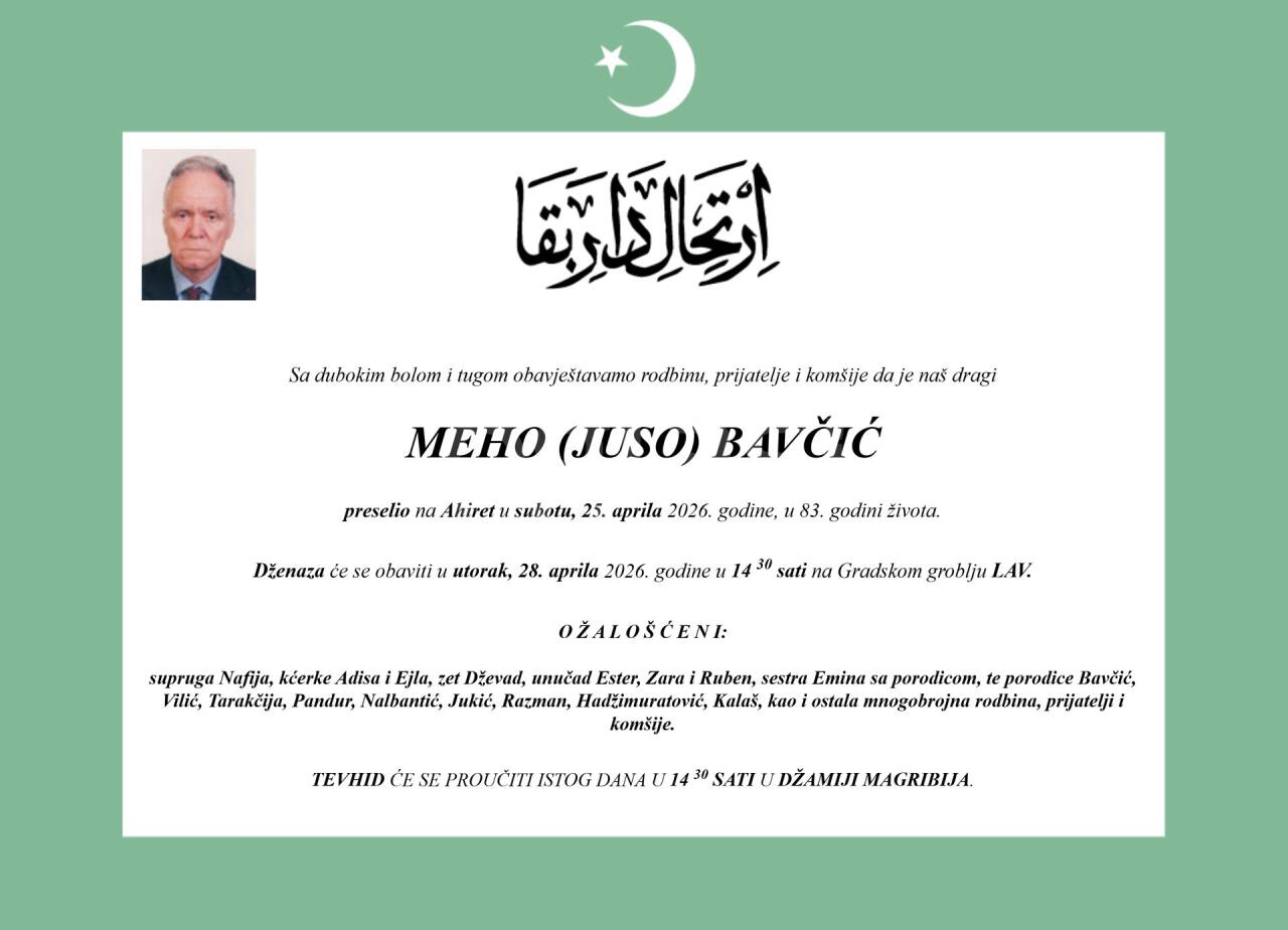 Dženaza: utorak, 28.04.2026. u 14:30h