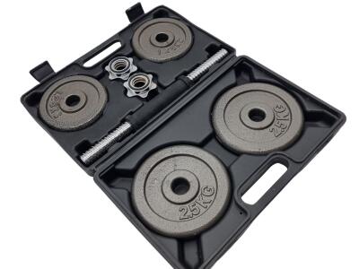 Set 10kg u plastičnoj kutiji.Tegovi 2x2.5kg i 2x1.25kg + težina šipke ukupno 10kg.Prodaje se sve u p...