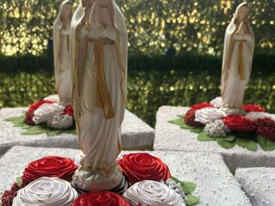 Cvjetni aranžmani sa kipom djevice Marije. Sve vrste po Vašoj želji.